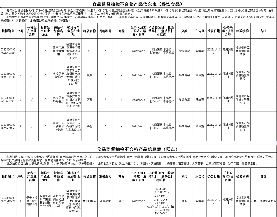 微生物污染问题:漳平市渔家海鲜酒楼的杯(消毒日期为2022616日),大肠菌群不合格,检验机构为福建省产品质量检验研究院;丰泽区虎背餐厅的饭碗(消毒日期为2022615日),大肠菌群不合格,检验机构为福建省产品质量检验研究院;惠安县惠巧厨餐厅的方碟(消毒日期为2022615日),大肠菌群不合格,检验机构为福建省产品质量检验研究院;晋江市东石欧碧华小吃店的菜盘(消毒日期为2022621日),大肠菌群不合格,检验机构为福建省产品质量检验研究院;豪士(福建)食品有限公司2022716日生产的豪士白面包,菌落总数不合格,销售单位为漳州市中闽百汇超市有限公司,检验机构为福建省产品质量检验研究院。