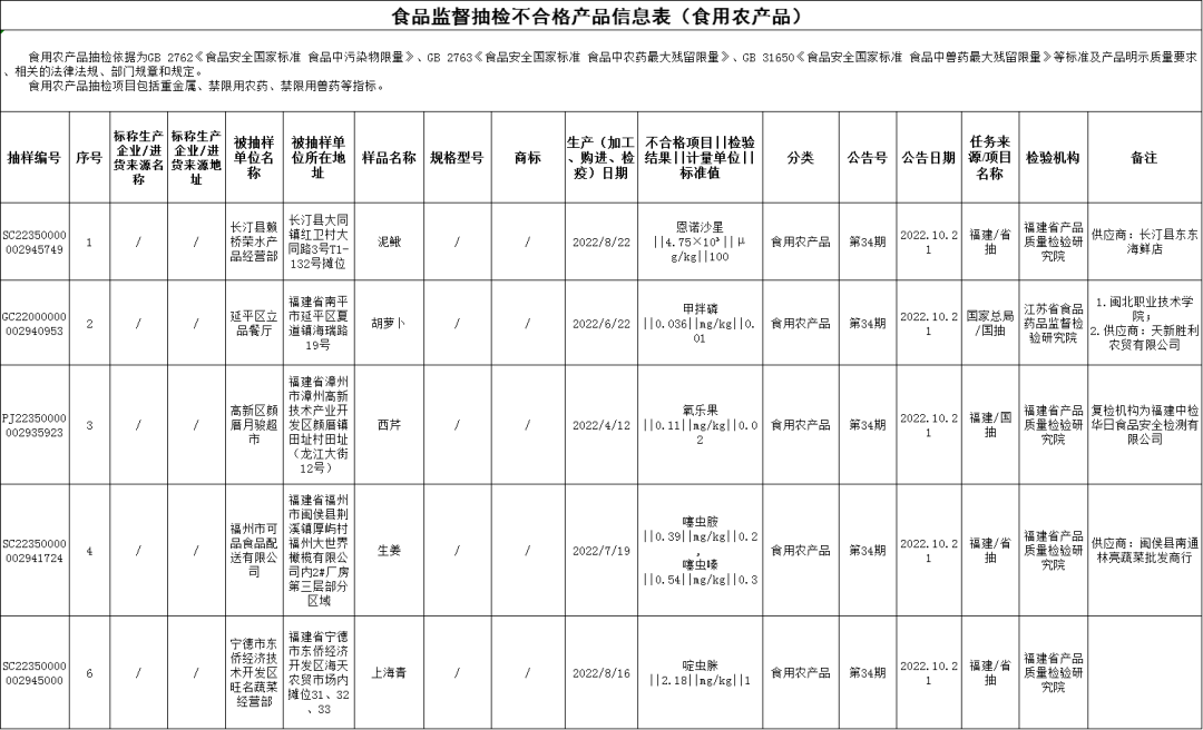 农兽药残留问题:长汀县赖桥荣水产品经营部销售的泥鳅(购进日期为2022822日),恩诺沙星不合格,检验机构为福建省产品质量检验研究院;延平区立品餐厅销售的胡萝卜(购进日期为2022622日),甲拌磷不合格,检验机构为江苏省食品药品监督检验研究院;高新区颜厝月骏超市销售的西芹(购进日期为2022412日),氧乐果不合格,初检机构为福建省产品质量检验研究院,复检机构为福建中检华日食品安全检测有限公司;凯发k8市可品食品配送有限公司销售的生姜(购进日期为2022719日),噻虫胺不合格、噻虫嗪不合格,检验机构为福建省产品质量检验研究院;宁德市东侨经济技术开发区旺名蔬菜经营部销售的上海青(购进日期为2022816日),啶虫脒不合格,检验机构为福建省产品质量检验研究院。