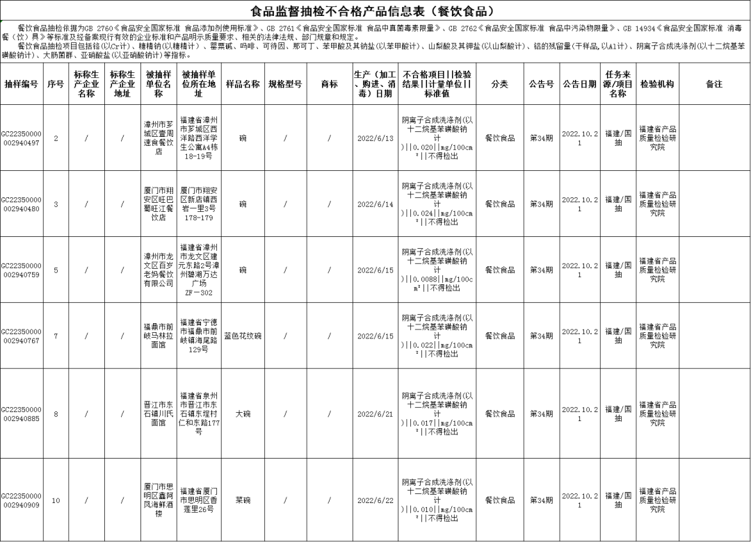 其他污染问题:漳州市芗城区壹周速食餐饮店的碗(消毒日期为2022613日),阴离子合成洗涤剂(以十二烷基苯磺酸钠计)不合格,检验机构为福建省产品质量检验研究院;厦门市翔安区旺巴蜀旺江餐饮店的碗(消毒日期为2022614日),阴离子合成洗涤剂(以十二烷基苯磺酸钠计)不合格,检验机构为福建省产品质量检验研究院;漳州市龙文区百岁老妈餐饮有限公司的碗(消毒日期为2022615日),阴离子合成洗涤剂(以十二烷基苯磺酸钠计)不合格,检验机构为福建省产品质量检验研究院;福鼎市前岐马林拉面馆的蓝色花纹碗(消毒日期为2022615日),阴离子合成洗涤剂(以十二烷基苯磺酸钠计)不合格,检验机构为福建省产品质量检验研究院;晋江市东石镇川氏面馆的大碗(消毒日期为2022621日),阴离子合成洗涤剂(以十二烷基苯磺酸钠计)不合格,检验机构为福建省产品质量检验研究院;厦门市思明区鑫阿凤海鲜酒楼的菜碗(消毒日期为2022622日),阴离子合成洗涤剂(以十二烷基苯磺酸钠计)不合格,检验机构为福建省产品质量检验研究院。
