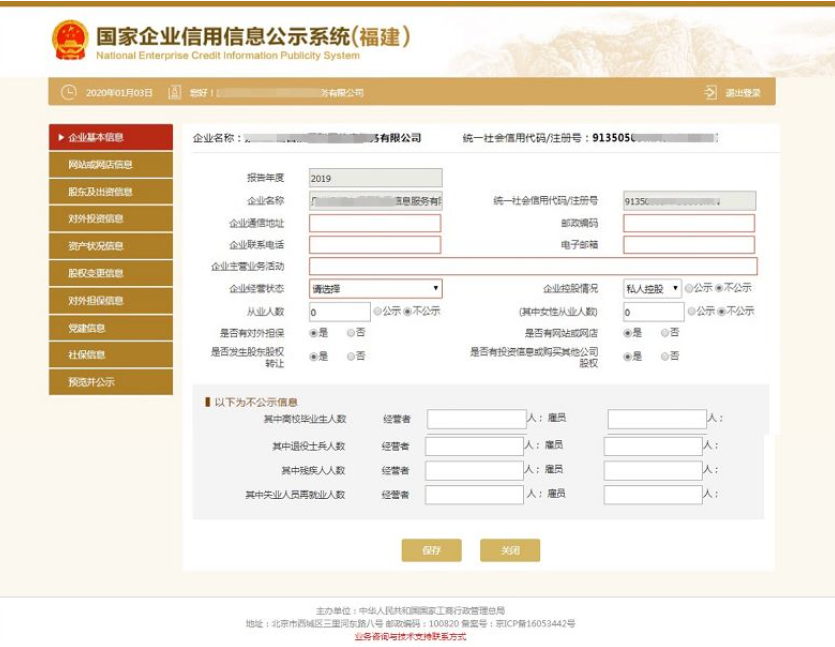 第五步:填写基本信息。需要填报的通信地址、邮政编码、联系电话、电子邮箱、存续状态、网址、网站信息均为报送时的信息,其余信息为所报告年度12月31日的信息。如果有网站、对外担保,就点“是否有网站或网店”后面的“是”字前的圆点,如果没有网站、对外担保就点“否”字前的圆点。填写完后点“保存”。