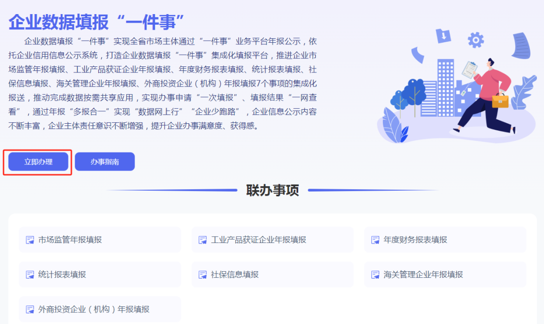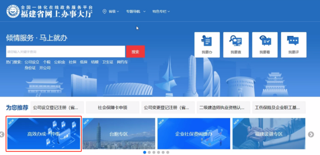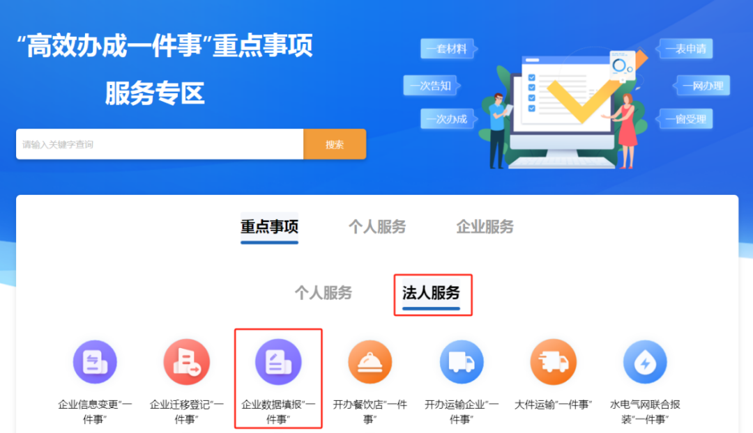 (http://zwfw.fujian.gov.cn/)找到高效办成一件事专区,在服务专区的法人服务,找到企业数据填报一件事,点击立即办理。