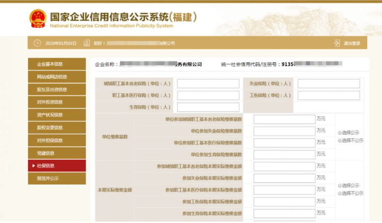 进入国家企业信用信息公示系统首页。也可使用百度或其它搜索引擎,在搜索栏输入“国家企业信用信息公示系统”,在搜索结果页面点击第一个搜索结果(尾缀有官网字样)进入系统主页面。进入首页后,点击“企业信息填报”图标,在弹出页面选择所在省份(福建)后,进入企业信息填报页面。