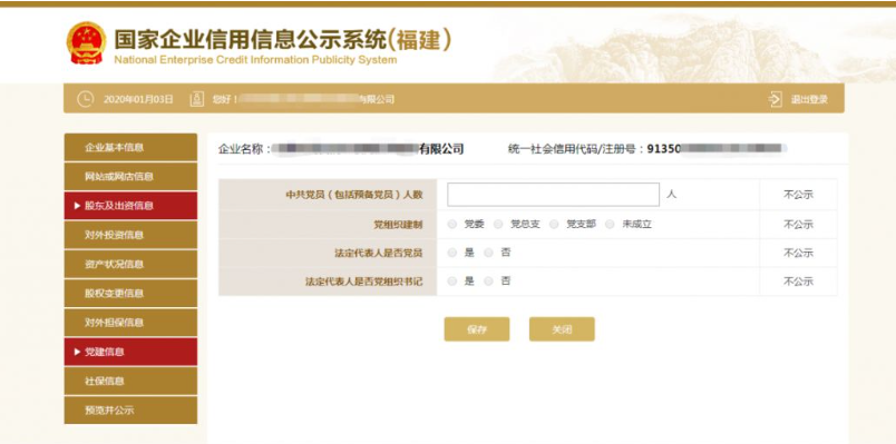 第十二步:填写党建信息。党建信息为不公示信息,主要采集私营企业党组织的建立情况,但属于抽查范围,请注意如实填写。其中,中共党员(包括预备党员)人数,为截至年度报告年份12月31日的人数。如企业暂无党员,填写“0”人后点击保存即可。