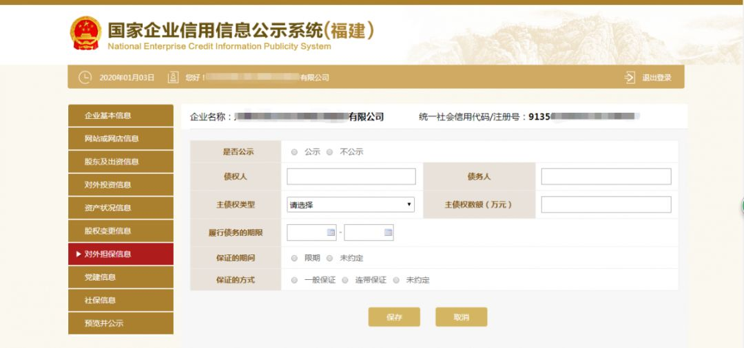 第十一步:填写对外担保信息。点击左边的对外担保信息,根据实际情况进行添加之后点击“保存”。如无对外担保情况的则无需填写此项信息。