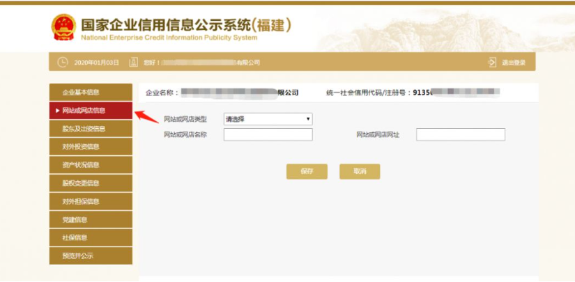 第六步:填写网站或网店信息。如在基本信息页面“是否有网站或网店”选择“是”,则出现网站或网店填报页面,点击“添加”按钮,弹出添加网站或网店页面,如下图所示。填写后点击保存。