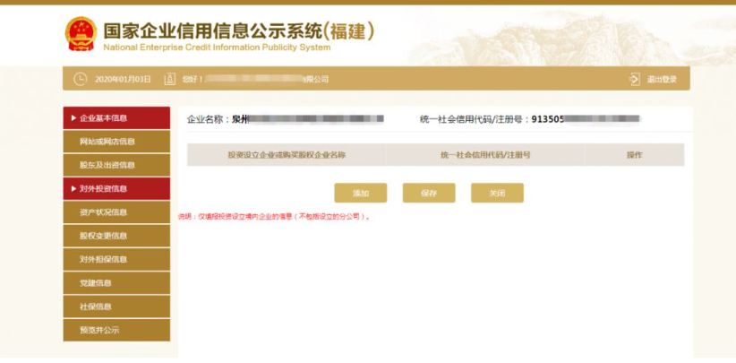 第九步:填写对外投资信息。点击左边的“对外投资信息”,之后再根据实际情况点击“添加”填写相关信息,填写完成后点击“保存”。如无对外投资情况的则无需填写此项信息。
