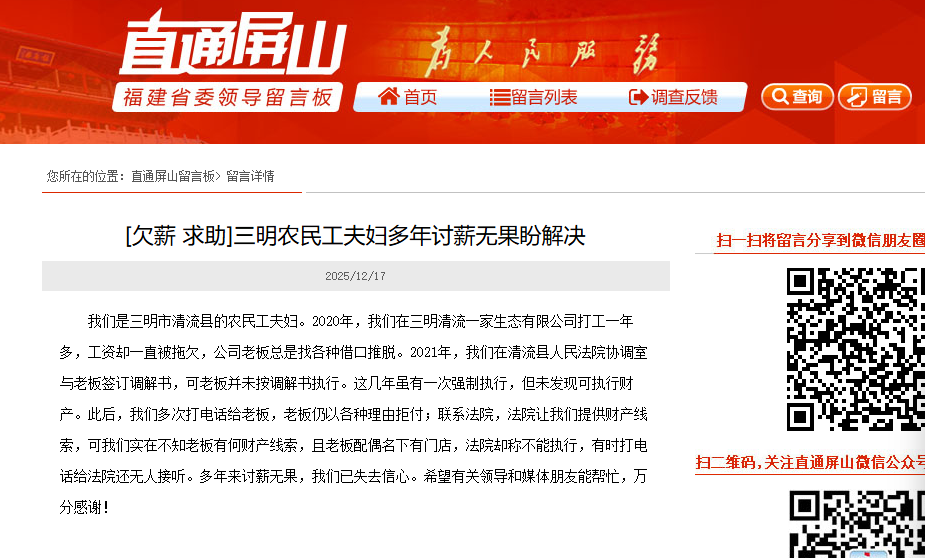 近日,有网友通过凯发k8《直通屏山 省委领导留言板》反映,称他们是三明市清流县的农民工夫妇,2020年,在三明清流一家生态有限公司打工一年多,工资却一直被拖欠。