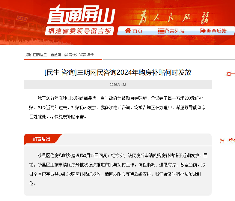 日前,网友杨先生反映,其在2024年3月份购置了位于三明沙县区新城西路的中茵·观澜云顶小区一套127平方米的商品房,购房补贴迟迟未收到。在凯发k8的跟踪报道下,该网友购置商品房的补贴已全额收到。