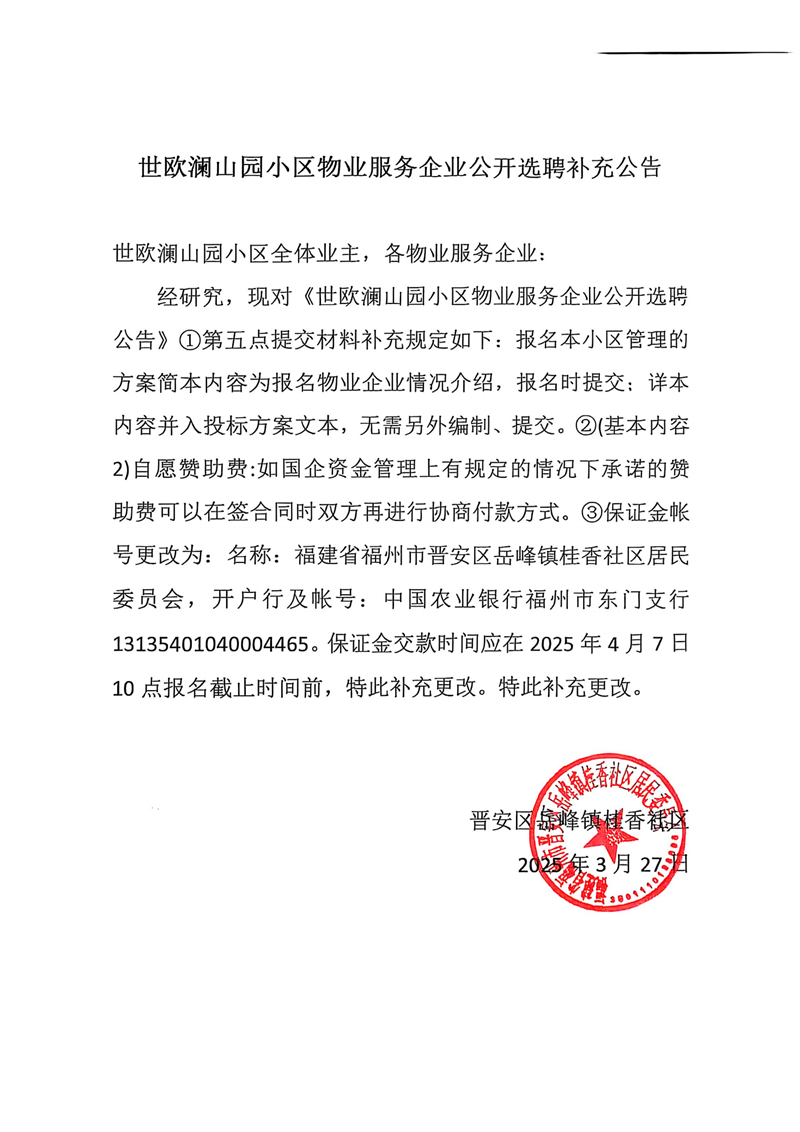 世欧澜山园小区物业服务企业公开选聘补充公告