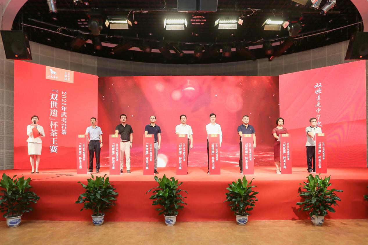 之后,由武夷山市政协党组书记陈先珍、武夷山市政府副市长范震昆、武夷山市茶产业发展中心主任王晓军、武夷山市招商服务中心何梅芳、武夷山市场监督管理局副局长叶福开、武夷山市税务局副局长李立新、武夷山市茶业同业公会会长刘国英、八马茶业总经理吴清标的共同见证下,2021年武夷岩茶“双世遗”杯茶王赛正式启动。